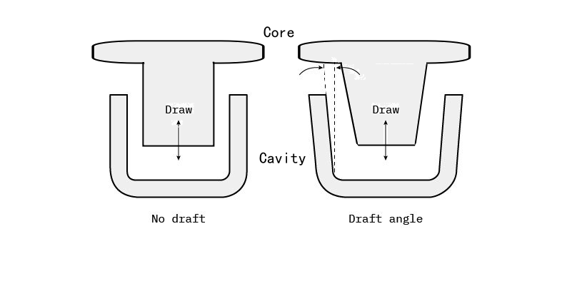 Sob a premissa de cumprir as funções do produto e não afetar a montagem, um ângulo de rascunho maior deve ser adotado o máximo possível. Esta é a maneira mais econômica e eficaz de aumentar o rendimento de produtos qualificados e prolongar a vida útil dos moldes. Se todos os fatores exigirem um ângulo de rascunho extremamente pequeno, é necessário considerar o uso de estruturas de molde, como lâminas ou núcleos, para alcançar a Demolding, mas isso aumentará significativamente a complexidade e o custo do molde.